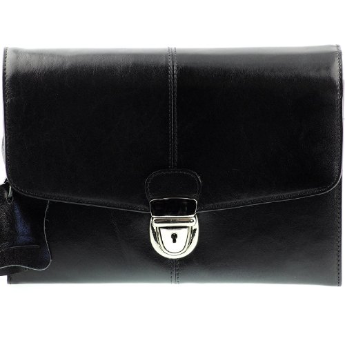 Sacoche en cuir de couleur noir, fermée par un rabat doté d'une serrure à fermeture à clé et disposant d'une poche à zip à l'arrière et d'une poignée pour le transport.